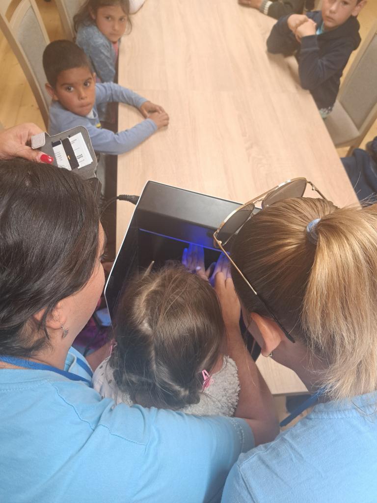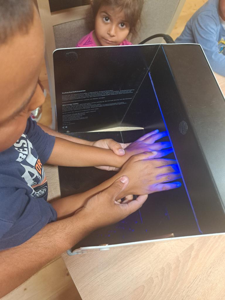 Zaujímavým spestrením a pre nás úplne novou skúsenosťou bolo použitie UV lampy so špeciálnym gélom, s ktorou trpezlivo pracovala asistentka podpory zdravia z lokality Cerovo p. Lenka Kováčová a vďaka ktorej si deti mohli na svojich neumytých a potom aj umytých rukách odsledovať ich čistotu. To bolo prekvapenia a úžasu, koľko bacilov, vírusov, baktérií sa nachádza na ľudských rukách! Dokonca aj po umytí rúk, ale nesprávnom a nedostatočnom. A tak deti prostredníctvom vlastnej skúsenosti a osobného zážitku pochopili aké dôležité a zdravé je SPRÁVNE UMÝVANIE RÚK.